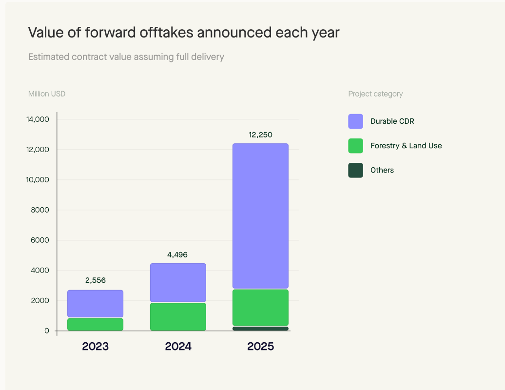 Both reports reveal that carbon market is shifting from “volume to value”. While the number of unique buyers has stayed relatively flat at around 8,000, the total value of offtake agreements announced in 2025 has surpassed $10 billion. Sylvera reports, that there is a concentration of forward deals among a small cohort of roughly 100-200 sophisticated buyers who are increasingly willing to pay a premium for quality, with average offtake prices for removals hitting $160 per tonne.
