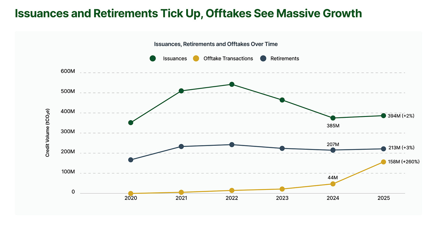 If you are a long time reader, you might remember Kristjan’s article on the move from voluntary carbon market v1 (VCM 1.0) to VCM 2.0. Don’t just take our word for it, two big players in the space, Sylvera, a credit ratings agency, and Allied Offsets, a market intelligence platform, have just released their reports with the latest 2025 data and it’s clear: offtakes are taking off.