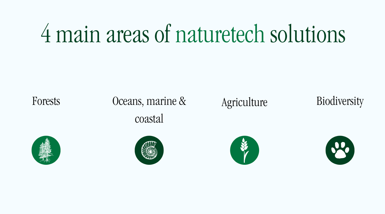 Naturetech is addressing many different areas of nature restoration, protection and enhancement - from reducing the amounts of GHG released during farming to increasing carbon storage in our oceans. Naturetech companies are mainly looking for solutions in four main areas of the environment.
